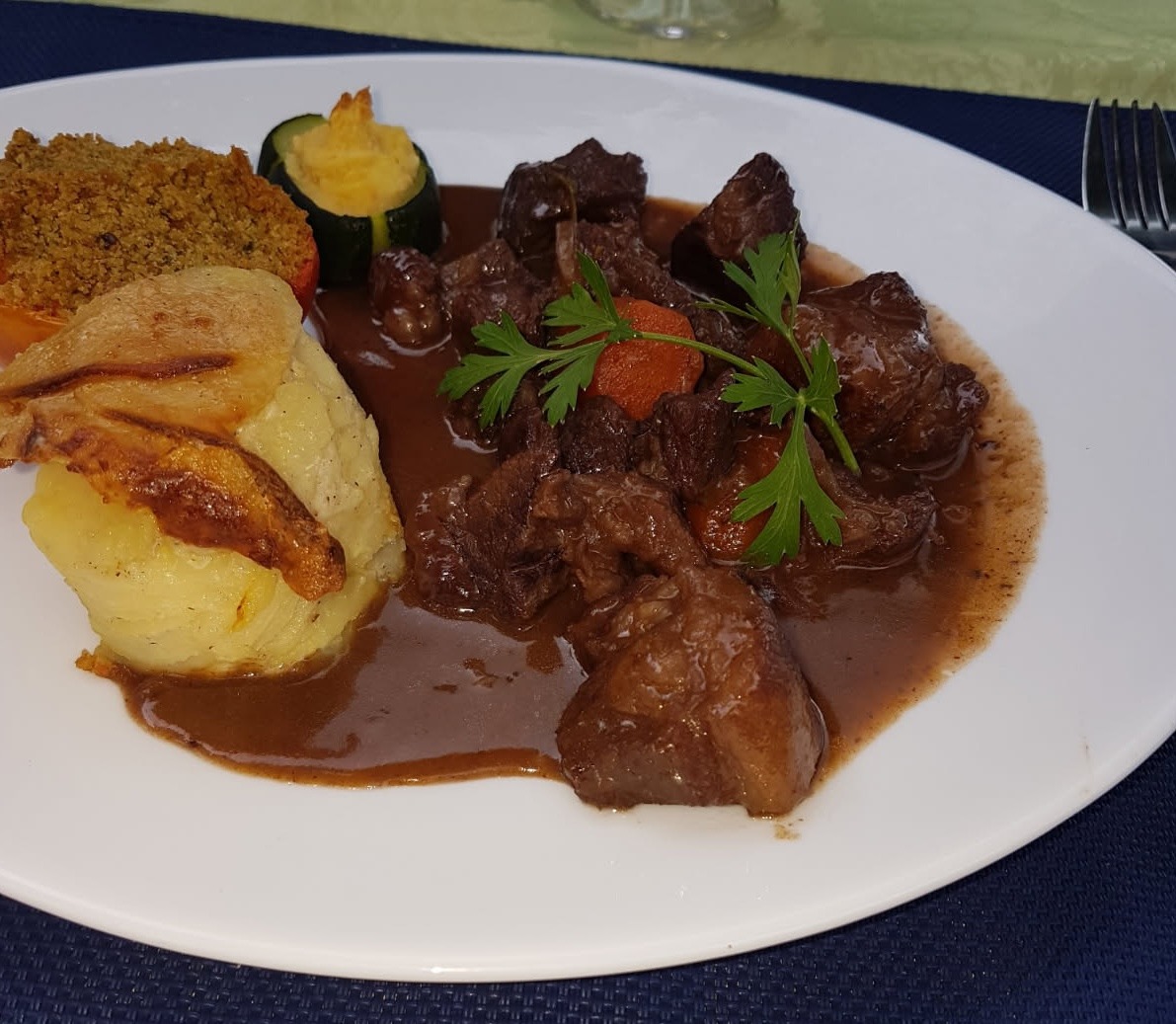 Evelyne et Rodolphe vous proposent chaque semaine une ardoise différente selon les arrivages et les produits de saison… Viandes, poissons, légumes et pâtisserie sont agréablement parfumés et relevés par les herbes fraîches de notre jardin aromatique, amoureusement cultivés par notre jardinier.